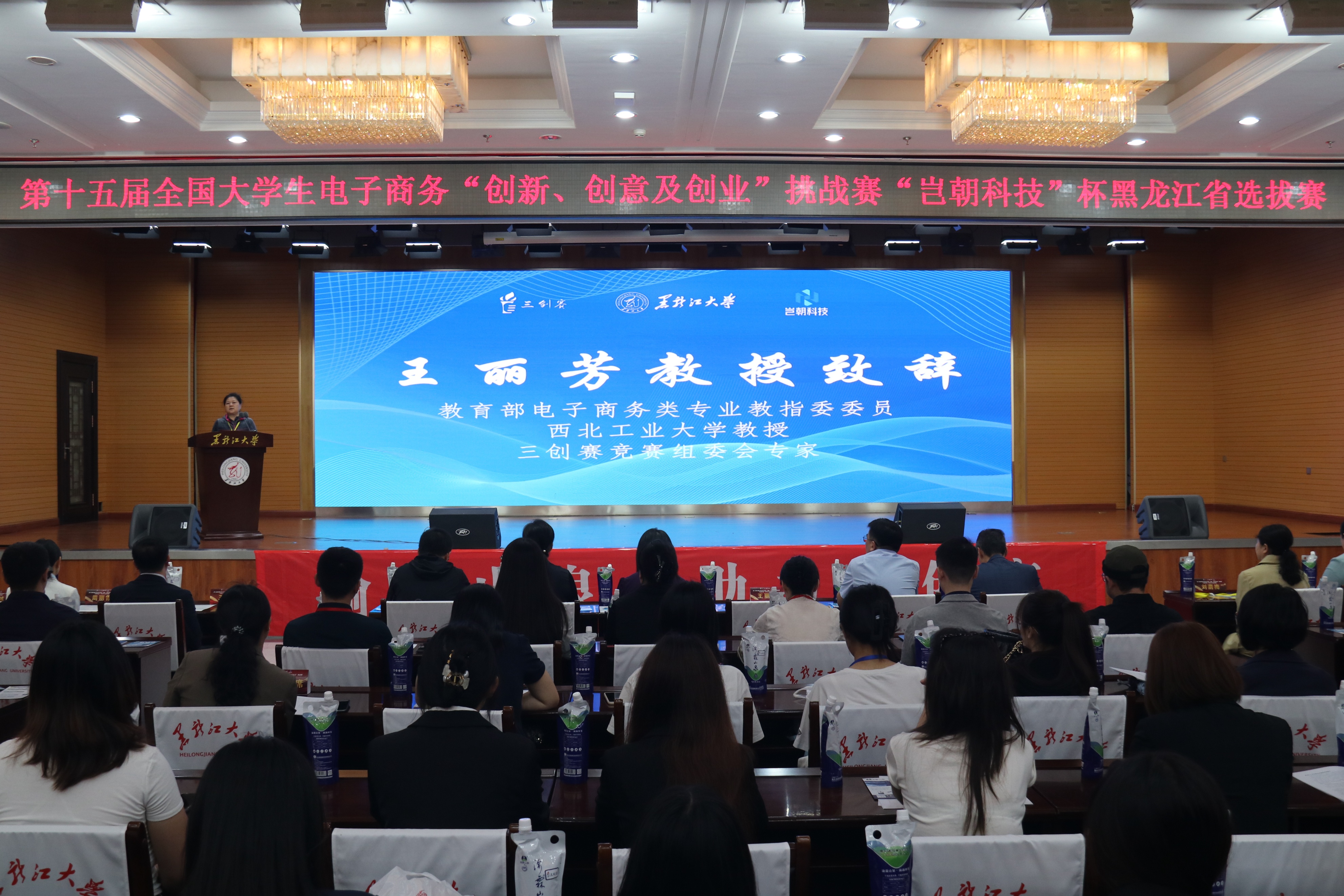 “三创赛”竞赛组委会专家、教育部电子商务类专业教指委委员、西北工业大学王丽芳教授致辞,希望龙江学子们通过路演展示展现创新精神,以昂扬风貌追逐创业梦想。